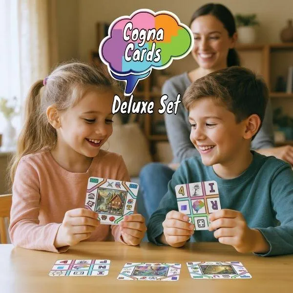 The CognaCards Deluxe Set is the hands-on toolkit for developing thinking skills that last a lifetime —right from your kitchen table.